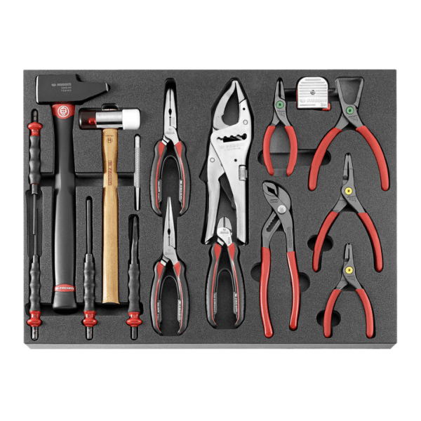 | Alicates | Alicate de corte diagonal > 2 alicates de pontas (direito e curvo, bico longo) > Alicate de pressão 250 mm > Alicate de pressão (bico longo) > 4 alicates de freios |