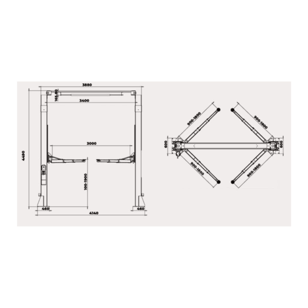 Único no mercado com uma largura entre colunas de 3,40m e braços com comprimento máximo de 1,80m.